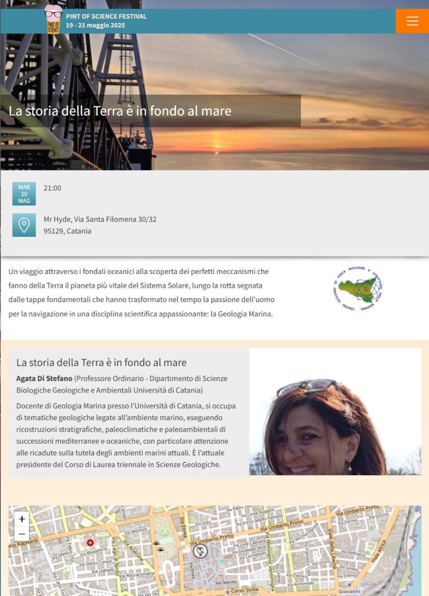 Nell'ambito dell'iniziativa "Pint of Science", martedì 20 maggio alle ore 21:00 presso il Mr Hyde (via Santa Filomena 30/32, 95129 Catania), la Prof.ssa Agata Di Stefano terrà un seminario dal titolo "La storia della Terra è in fondo al mare".