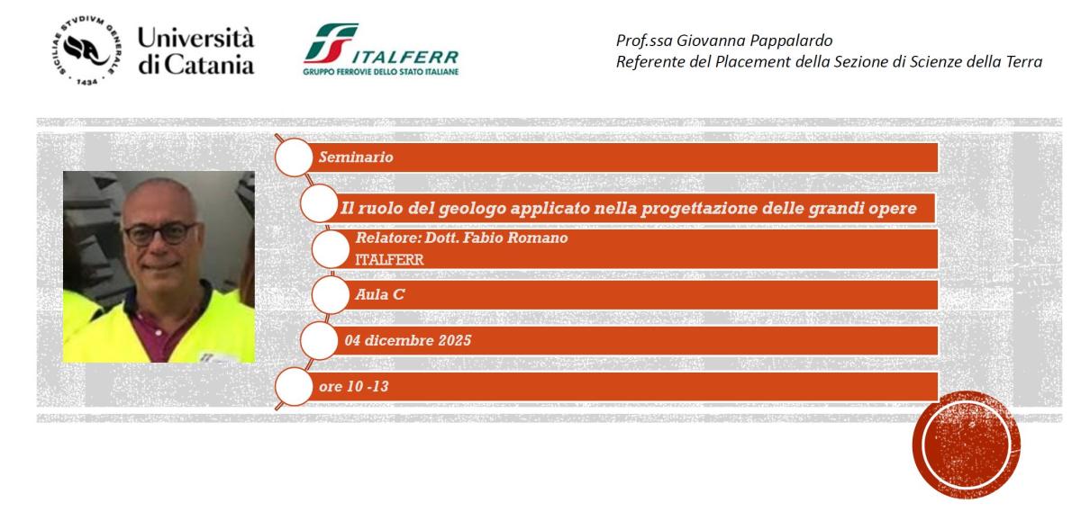 vi invito a partecipare al seminario seminario dal titolo "Il ruolo del geologo applicato nella progettazione delle grandi opere" tenuto dal Dott. Fabio Romano di ITALFERR, giorno 4 dicembre alle ore 10:00 in aula C: