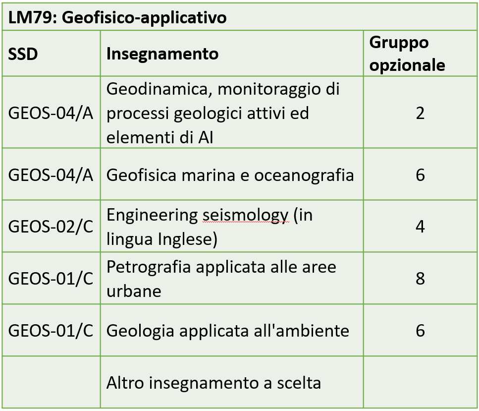 Il piano di studio "Geofisico-applicativo" forma laureati magistrali con competenze nell’applicazione dei metodi geofisici allo studio del sottosuolo e dei processi geologici attivi. Il percorso fornisce strumenti per l’interpretazione dei dati geofisici, integrando misure strumentali e osservazioni geologiche per la caratterizzazione delle strutture geologiche e delle proprietà dei materiali. Il piano approfondisce l’impiego di tecniche geofisiche terrestri e marine e metodi quantitativi di analisi dei dati, con applicazioni alla caratterizzazione del sottosuolo, al monitoraggio ambientale e alla valutazione delle criticità ambientali. Nel complesso, il percorso forma figure in grado di utilizzare i metodi geofisici per analisi del sottosuolo, monitoraggio dei processi attivi e applicazioni professionali e di ricerca.