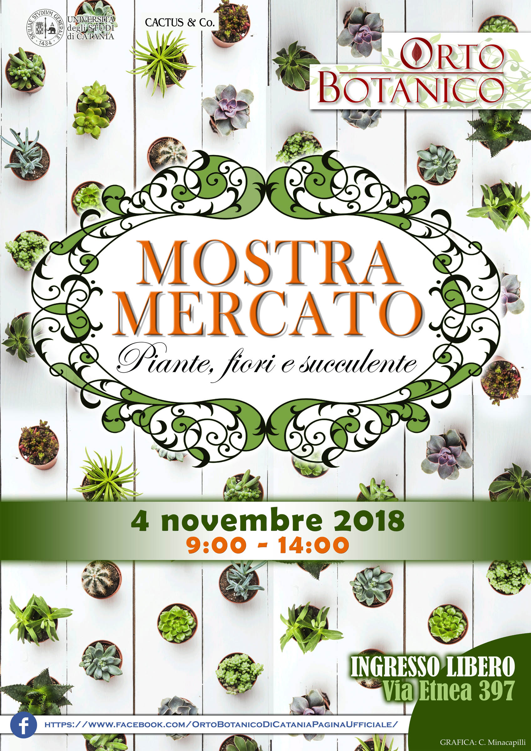 Domenica 4 Novembre 2018 dalle ore 9 (fino alle ore 14), l’Orto Botanico dell'Università di Catania (via Etnea, 397) ospiterà la tradizionale Mostra Mercato di piante, fiori e succulente. L’iniziativa è promossa dal Dipartimento di Scienze Biologiche, Geologiche e Ambientali (diretto dal Prof. C. Monaco) e dall’Orto Botanico (Responsabile Scientifico Prof. G. Giusso del Galdo) ed è organizzata dall’associazione “Cactus & Co.” (Marco Avolio) e dal responsabile tecnico dell’Orto Botanico (Giovannino D’Agata).
