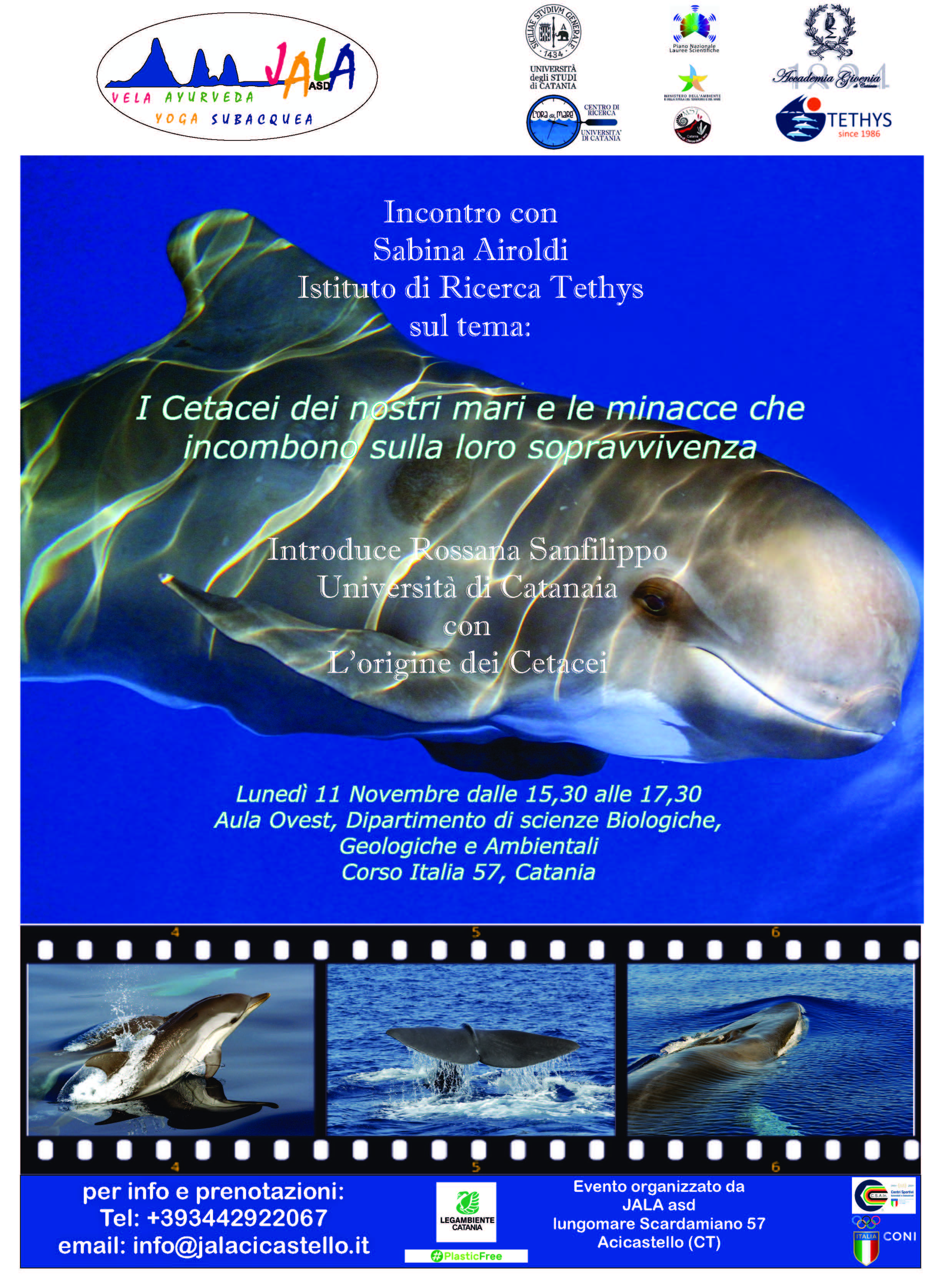 Lunedì 11 novembre ,alle ore 15:30, presso l’aula Ovest del Dipartimento di Scienze Biologiche Geologiche e Ambientali, Sezione di Geologia, Corso Italia 57, Catania, si terrà un incontro dal titolo "I Cetacei dei nostri mari e le minacce che