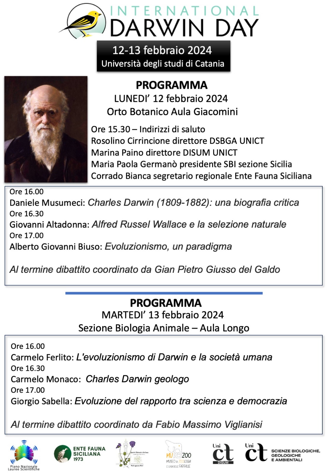 International Darwin day Il Dipartimento di Scienze Biologiche, Geologiche e Ambientali e il Dipartimento di Scienze Umanistiche organizzano per il 12 e 13 Febbraio 2024 una due giorni di conferenze e dibattiti per il Darwin Day. Condividi Facebook Twitter Whatsapp Telegram Email