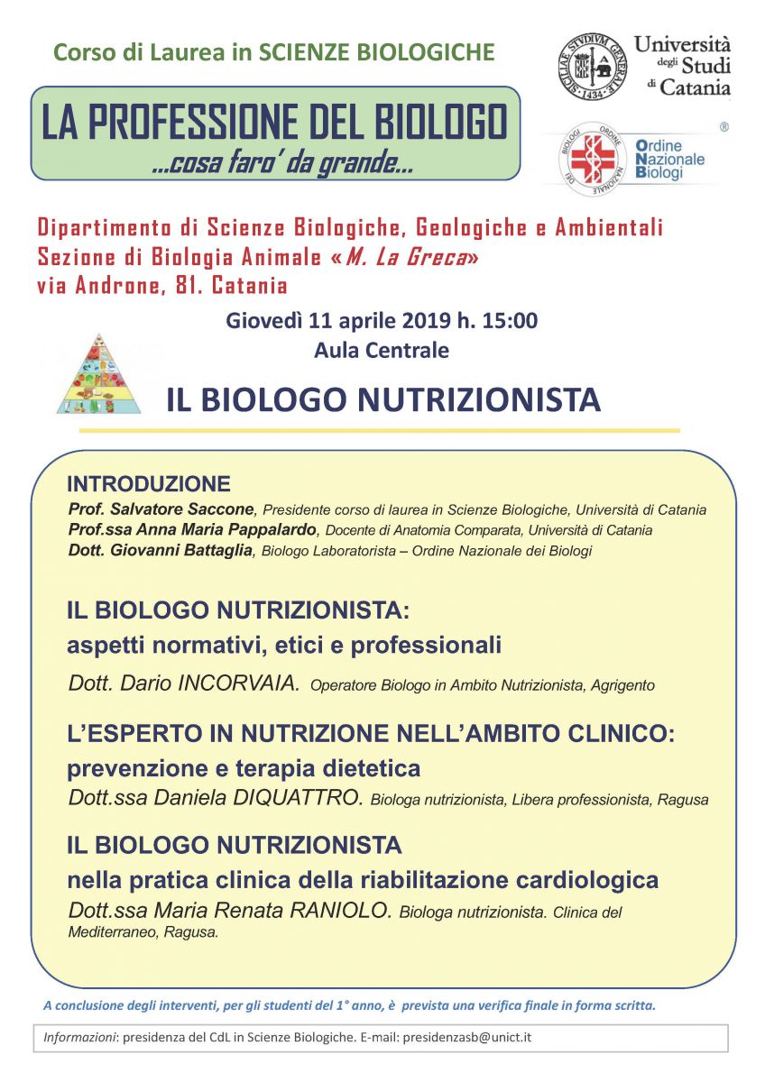 Si avvisa che giorno 11 aprile 2019 si terrà il quarto incontro del ciclo “Professione Biologo… cosa farò da grande…" su “IL BIOLOGO NUTRIZIONISTA".